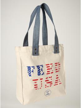 As can be seen in the photo above (snapped by Thomas Martin, via imgur), Gap invites shoppers to "buy these limited edition bags and we'll donate $5 to our nation's school lunch programs." Topping off the patriotic promotion is a "Made in USA" logo on the bags and in-store signage.